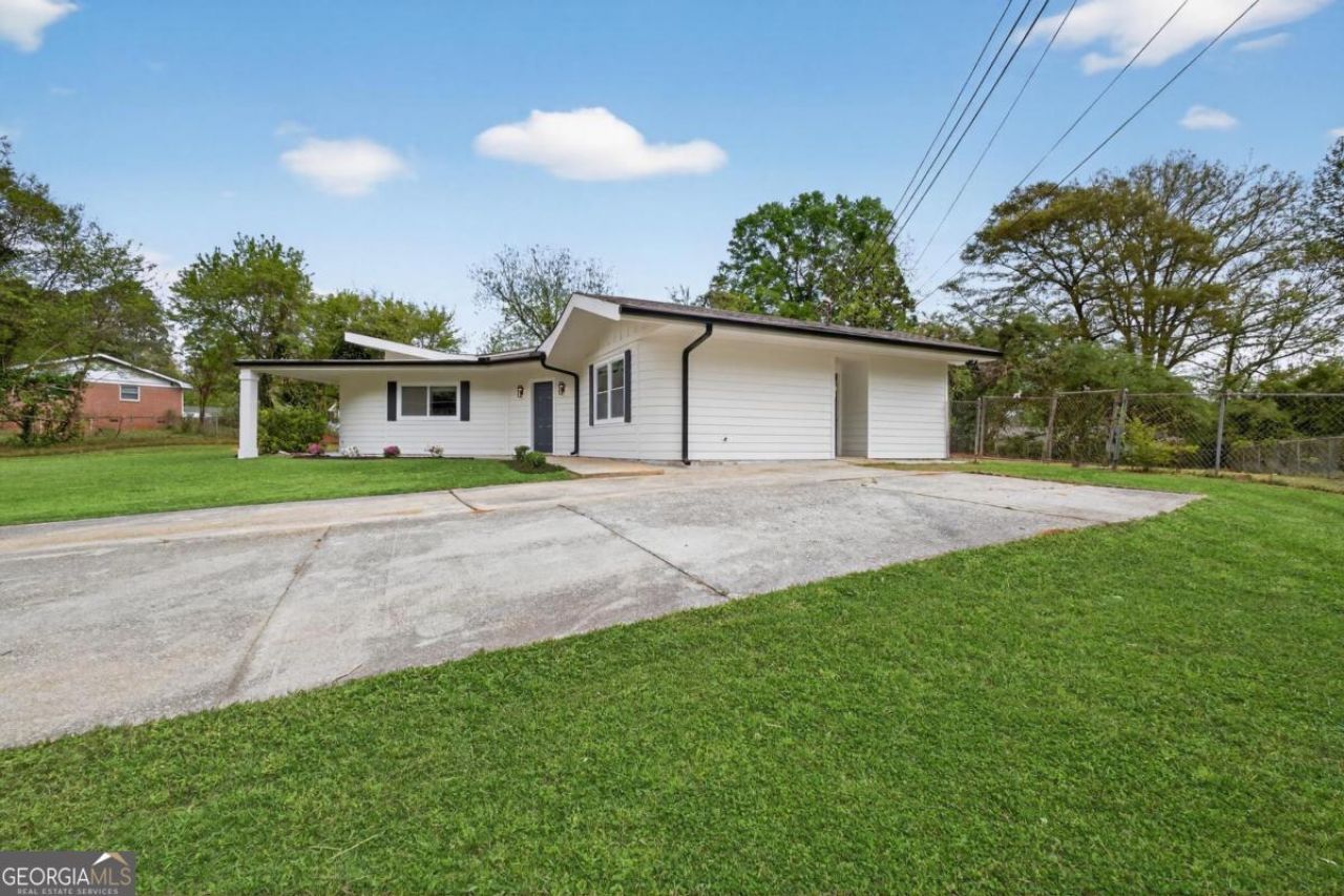 Stunning completely remodeled 4-bedroom, 3-bathroom ranch nestled on a spacious lot, offering thoughtfully designed single-level living with high-end finishes throughout. From the all-new siding and fresh exterior paint to the brand-new flooring, fixtures, and fully renovated bathrooms, every inch of this home has been transformed and truly move-in ready. The layout is one of this home's most distinctive features. A generous living room serves as the central gathering space, connecting the main bedroom wing to the private primary suite a smart and functional floor plan that offers excellent separation between the primary suite and secondary bedrooms. The fully renovated kitchen is both stylish and practical, featuring white raised-panel cabinetry accented with matte black hardware, rich dark granite countertops, a designer hexagon tile backsplash, a peninsula breakfast bar, and a full suite of stainless steel appliances including a gas range and French door refrigerator. The primary suite is tucked in its own private wing of the home, accessible through a dedicated entry and featuring a walk-in closet and a spa-caliber ensuite bath. The bathroom is a true showpiece a double vanity with white shaker cabinetry, marble countertops, and matte black fixtures sits beneath transom windows that bathe the space in natural light, while a massive glass-enclosed shower with large-format marble-look tile, built-in niche, interior lighting, and sleek black-framed glass doors makes a lasting impression. The three secondary bedrooms are all generously proportioned and served by two fully renovated full bathrooms. One features a gray shaker vanity with marble countertops and a bold mosaic glass tile shower with wave-pattern wall tile. The other offers a crisp white vanity, marble countertop, matte black faucet, and a floor-to-ceiling tiled glass-enclosed shower with stone-look tile and black frame detailing. A conveniently located laundry area serves the secondary bedroom hall. The backyard is a standout; flat, open, and fully fenced, with a detached outbuilding finished to match the home's new exterior, ideal for a workshop, studio, or extra storage. With its unique angular footprint, private primary suite wing, three fully renovated bathrooms, and meticulous attention to detail throughout, this home offers something truly different in today's market.
