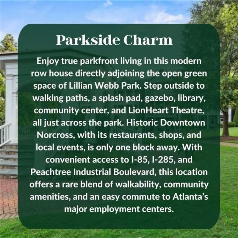PARK-FRONT LOCATION IN DOWNTOWN NORCROSS || DIRECT ACCESS TO LILLIAN WEBB PARK || THREE BALCONIES + FRONT PORCH || WALKABLE TO DINING, SHOPS, AND EVENTS || CORNER LOT WITH BRICK EXTERIOR ||FROM THE OWNERS:What makes this home special is how connected it is to Lillian Webb Park?you step outside and you're immediately part of it. The natural light, park views, and ability to walk to events, restaurants, and daily conveniences made living here easy and enjoyable. From fireworks to weekend activities, there's always something happening just outside your door. Even after moving and renting it, this home has remained meaningful to us, and we hope the next owners feel that same connection.FROM THE LISTING AGENT:This property is defined by its direct park-front positioning and walkable access to Downtown Norcross. The value is driven by location, outdoor living design, and the ability to integrate daily life with the surrounding environment, which is not easily replicated within the same market.A compiled 'Life at 124 Parkside West Court property summary is available for review and includes the owner's perspective, documented improvements and maintenance history, neighborhood insights, and answers to KEY BUYER QUESTIONS designed to help buyers evaluate the home with clarity and confidence.