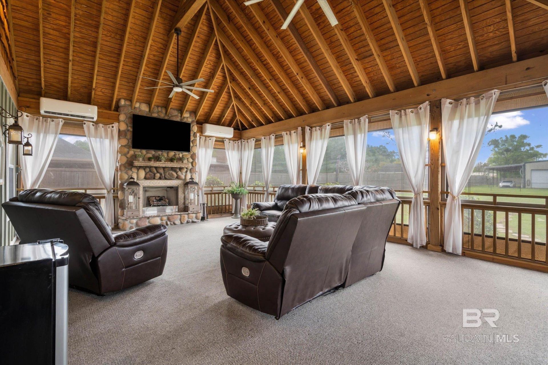 Located on 1.2 acres in Stapleton, this 3 bedroom, 2.5 bath single-family home built in 2007 features an open-concept layout with a living room that includes a brick accent wall and wood-burning fireplace, a separate dining area, and a kitchen with granite countertops, center island, pantry, coffee bar, travertine tiled kitchen island, backsplash, and stainless steel appliances that convey with the home.Vaulted ceilings with rustic wood accents, crown molding, and plantation shutters are found throughout. The primary suite offers a spacious bedroom with a large walk-in closet featuring a built-in ironing board, dual vanities, soaking tub, and separate walk-in shower.Additional features include a large 449 sq ft heated and cooled screened porch (sunroom) with commercial-grade roll-up screens, stone gas propane fireplace, plus two supplemental wall-mounted heating and cooling units, covered deck, and fully fenced backyard. Recent updates include a repainted 2-car garage with sealed floors, new exterior trim, and replaced back steps to the deck. The home has a 2020 roof (not fortified), HVAC approximately 10 years old, and there is no HOA. A separate 600 sq ft rental apartment and a 30x40 barn is included on the property. Buyer to verify all information during due diligence.