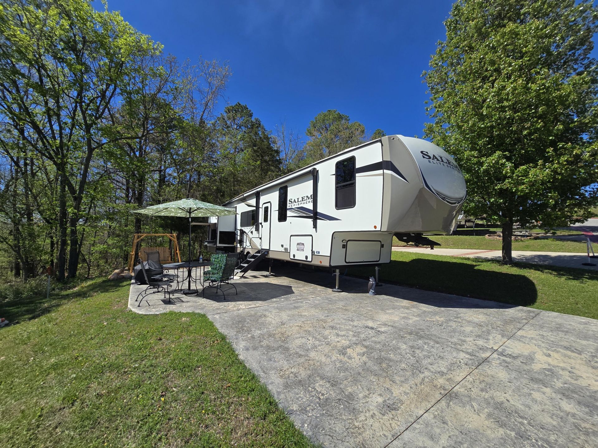 Discover luxury lake living in Cricket Creek RV Estates with this turnkey RV lot--sold complete with a 2024 Forest River Salem Hemisphere Elite, loaded with high-end upgrades and a transferable Good Sam Extended Service Contract for peace of mind. This RV was purchased new, set up here, and has not moved since! Step inside to an impressive open-concept living area featuring a cozy fireplace, 55'' TV, theater seating, and a true residential feel. The king-size bedroom offers a large lighted closet and premium finishes, and the bathroom has a walk-in shower. The gourmet-style kitchen includes a 20-cubic-ft refrigerator and abundant storage. This RV is packed with luxury extras, plus a full outdoor kitchen with a 50'' TV, perfect for entertaining or enjoying evenings by the lake. The lot includes outdoor furniture, fire pit, and a storage shed, making this an effortless, fully set-up retreat. Cricket Creek RV Estates delivers a resort-style experience with a pristine pool, inviting clubhouse, and sewer + water included in the HOA dues. Best of all, you're located near the entrance to Cricket Creek Marina, offering boat rentals, slip rentals, boat launch, and a swim area. Just 10 minutes to Big Cedar and Top of the Rock, and 20 minutes to Branson attractions, shows, and dining--this property offers unmatched convenience and a luxury lake lifestyle. Welcome to your private lake getaway, simply arrive, relax, and enjoy your premium Table Rock Lake escape.