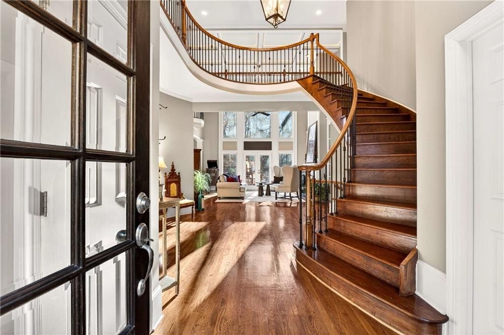 Welcome to this beautifully maintained executive home nestled in the highly sought-after gated River Falls community in Roswell. This elegant residence blends classic Southern charm with modern updates, offering the perfect combination of comfort, style, and livability. Double beveled front doors open to a dramatic 2 story circular foyer featuring an elegant spiral staircase. Beautiful 2-story great room features a wall of windows, cove lighted coffered ceiling & bookcases flanking the double-sided gas log fireplace. The gracious oversized dining room features architectural columns, exquisite moldings, hardwood floors with a custom inlay & wainscoted walls. A gourmet chef's kitchen with designer cherry cabinetry, granite countertops, Jenn-Air stainless steel appliances, island with vegetable sink, stacked stone breakfast bar & separate pantry. The spacious 2-story keeping room opens from the kitchen & highlights the charming stacked stone fireplace. Luxurious primary suite on main with tray ceiling boasts dual closets & an elegant spa bath with double vanities, double shower heads + handheld & heated marble floors. Two private bedroom suites upstairs - one is a 2nd primary suite with oversized marble bath & double closets - with high ceilings & cove lighting. A wonderful bonus room/4th bedroom upstairs has ample lighting & storage. The fully finished terrace level is an entertainer's dream, featuring 14' ceilings, a billiards room, an impressive home theatre with 144 screen & projector, a cozy office area with fireplace, a spacious guest suite/5th bedroom, and a full bath showcasing an exquisite stone sink & travertine finishes. The space also includes a plumbed & wired area ready for a future kitchen or bar, offering incredible potential for customization. Gorgeous decks overlook magnificent views of protected woodlands & creek. Additional features include designer lighting, intercom & stereo system, 7 zone programmable thermostats, security & irrigation systems & yard maintenance. Located in a prime Roswell location just minutes from Historic Downtown Roswell, the Chattahoochee River, East Roswell park, schools, shopping & dining. This home combines the best of convenience and tranquility.