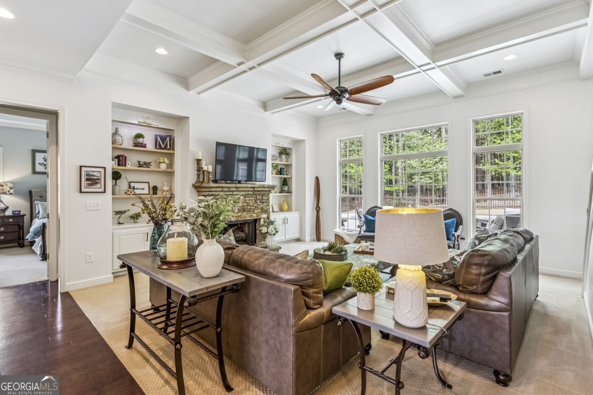 Listed Under Recently Appraised Value! Perfectly positioned on a quiet cul-de-sac in the prestigious Great Oaks Estates Community, this exceptional Custom-Built Luxury Estate delivers a rare blend of timeless architecture, elevated design, and resort-style outdoor living all just 15 minutes from the charm and energy of Downtown Acworth. Enjoy easy access to one of the area's most beloved destinations, filled with local favorites like Henry's Louisiana Grill, 1885 Grill, boutique shopping, lake access, and year-round events that truly bring the community to life. A stately Three-Sided Brick Exterior, Mature Landscaping, and a welcoming Covered Front Porch create an unforgettable first impression. Inside, a Foyer Entrance opens to a stunning Formal Dining Room featuring classic Wainscoting and eye-catching Statement Wallpaper, setting the tone for refined entertaining. Rich Dark Hardwood Floors guide you into the breathtaking Fireside Family Room, where a dramatic Coffered Ceiling, Floor-to-Ceiling Windows, and a striking Stone Fireplace Flanked by Built-In Shelving create a light-filled yet inviting space. The Chef's Kitchen is the heart of the home, thoughtfully designed with Granite Countertops, a Tile Backsplash, Stainless Steel Appliances Including a Double Oven, a Large Center Island with Breakfast Bar, and a spacious Walk-In Pantry. The seamless flow into the Breakfast Nook and Keeping Room - complete with a second Stone Fireplace - creates the ultimate layout for both everyday living and elevated entertaining. The Main Level Primary Suite is a true retreat, offering a Tray Ceiling, a private Sitting Room with Bay Window, Dual Walk-In Closets, and a luxurious Spa-Style Ensuite with Dual Vanities, a Soaking Tub, a Spacious Tiled Shower, and a Water Closet. A convenient Half Bathroom and a well-appointed Laundry Room with Abundant Storage complete the main level. Upstairs, three additional bedrooms and two full bathrooms provide plenty of space, along with a Second Laundry Room for added convenience. The Oversized Fourth Bedroom with a Bar Area offers incredible flexibility as a Bonus Room, media space, or game room. Step outside to your own private oasis - an Entertainer's Dream featuring a Large Patio, In-Ground Pool, and a Flat, Fully Fenced Backyard surrounded by natural privacy. Whether hosting gatherings or enjoying quiet evenings, this outdoor space truly sets the home apart. Completing the property is a rare Five-Car Garage that includes a Dedicated Hobby Garage with an Automatic Lift to a Second-Level Storage Area, ideal for additional storage, hobbies, or showcasing vehicles. Blending luxury, space, and an unbeatable location, this home offers a lifestyle that is both elevated and effortlessly livable - where every detail has been thoughtfully designed to impress.