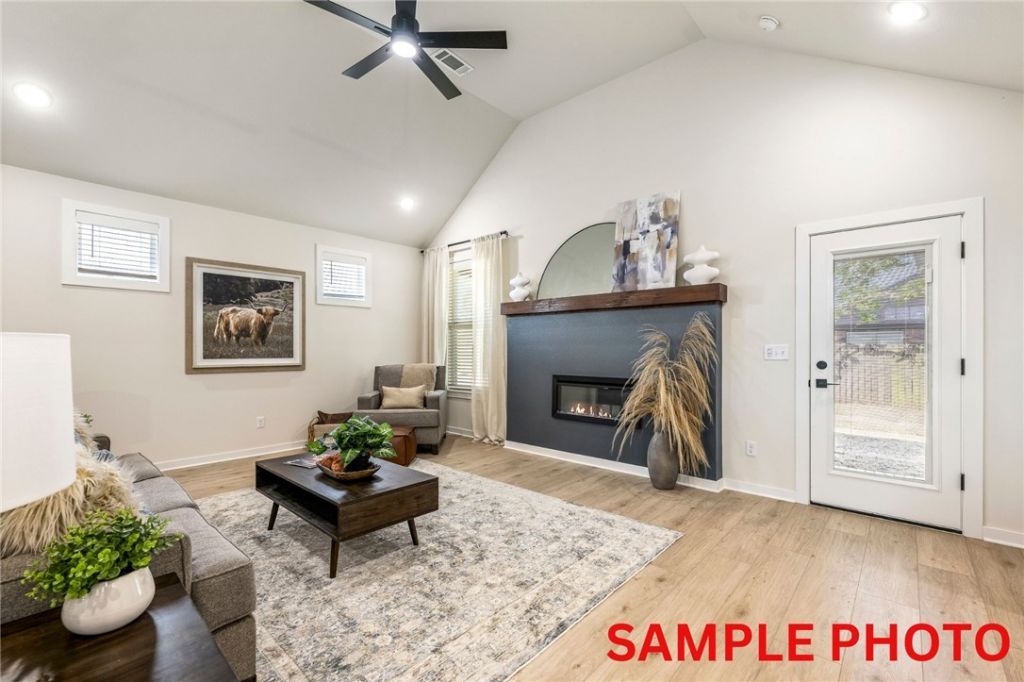 Fence, blinds and gutters included! Discover your dream home in the new neighborhood- Jacob's Crossing. Caden plan with 1 level! 13 ft ceilings in the living and dining, linear electric fireplace, LVP flooring throughout the main living areas & primary bedroom, quartz countertops & more. Chef's kitchen boasting frigidaire stainless steel appliances, gas range, pantry, quartz countertops, bar pull handles, large island & gorgeous backsplash. Luxurious primary bedroom features abundant natural light, while the spa-like primary bathroom offers a walk-in shower, double sinks, tub & spacious walk-in closets. Additional features include two large secondary bedrooms & a functional laundry room. Nestled on a generous lot with covered patio that overlooks the serene sodded, fully fenced backyard, creating an exceptional living experience. Sturdy concrete siding! Model home located at 3631 Tranquility St- Lot 1.