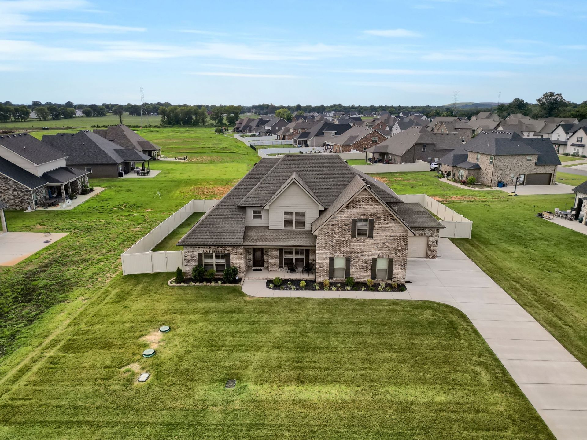 Total Turnkey! Immaculate and truly better than new, this all-brick home is loaded with upgrades- including plantation shutters, a full vinyl privacy fence and extensive custom shelving. Inside, you'll find a spacious open layout with a welcoming foyer, cozy fireplace, and stunning hardwood floors throughout the main level and stairs. The gourmet kitchen features granite countertops and custom cabinetry, while the formal dining and breakfast rooms offer flexibility for gatherings. The luxurious primary suite include double vanities, a tiled shower and walk-in closet. With 4 bedrooms, 3.5 bathrooms, and a versatile bonus room, this home provides ample living space. Plush carpet in the bedrooms adds comfort, while tile in all wet areas offer durability. The covered patio is perfect for relaxing outdoors. Uniquely situated for maximum privacy in a neighborhood setting- this lot sits between two streets with no immediate rear neighbors in view.