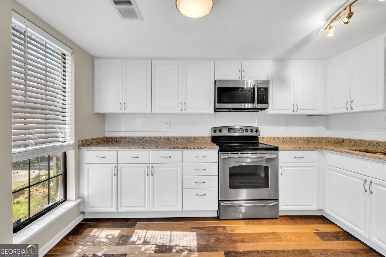 Two story condo less than a mile to downtown Alpharetta. Close to Wills Park, schools, shopping, 400 and 285. No unit above or below. Balcony at each level overlooks private wooded backyard. Stainless steel appliances and granite countertops installed Sept 2023. Laminate wood flooring on both levels. Trash, Water, Sewer and Termite/Pest Control included in Condo Association.