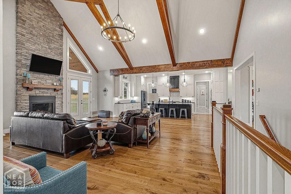 Experience elevated living in Terra Hills. Nestled on 2.97 acres with access to a stocked pond, this exceptional residence blends timeless design with modern luxury. Striking curb appeal welcomes you with board and batten siding, natural stone accents, and cedar beams that set the tone for what lies within. Inside, soaring vaulted ceilings, exposed cedar beams, and a dramatic floor-to-ceiling stone fireplace anchor the main living space, all framed by serene water views. The gourmet kitchen is a statement in both style and function, featuring premium CAF smart appliances, dual ovens, granite surfaces, a generous island, and a well-appointed butler's pantry. The main-level primary suite is a private sanctuary, offering tranquil pond views, a spa-inspired bath with a hydrotherapy soaking tub, custom tile shower, and a seamless connection to an expansive walk-in closet and laundry. The walk-out lower level is designed for entertaining and extended living, complete with a spacious lounge, kitchenette, additional bedrooms, and reinforced safe rooms for peace of mind. The downstairs is now completed with hardwood floors and all the amenities you expect in luxury living. This home is built with efficiency and longevity in mind, this home features geothermal HVAC, insulated concrete forms, spray foam insulation, and high-performance windowsdelivering both comfort and sustainability. Outdoors, a Trex deck with a wood-burning stone fireplace creates an unforgettable setting overlooking the waterperfect for quiet evenings or hosting in style. A rare opportunity to own a thoughtfully crafted, luxury retreat where every detail has been considered.