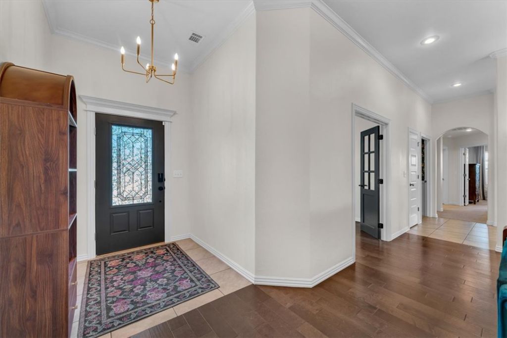 IDEAL FAMILY HOME. Large, immaculate, 4-5 bedroom home with 3 full baths on flat, oversized lot. One level, 10' ceilings throughout main living, open concept with split bedroom floorplan. Custom millwork and wall coverings throughout home. Crown molding in main living, paneled wall in dining, beadboard in bedroom. Recently painted - soft, neutral colors. Huge spacious kitchen with granite counters, walk-in pantry, gas range, and abundance of storage. Roof replaced spring, 2026, HVAC 2022. 4 dedicated bedrooms with flex room off living that could be 5th bedroom, home office, gym, 2nd living, study, den. Permanent basketball hoop to convey. 14'x15' partially covered backyard deck. Smart home features, including hardwired security system including glass break coverage. Coveted location on quiet dead-end/cul-de-sac, and walking distance to George Park & athletic complex and dog park. Or hop on the Greenway nearby, visit Sassafras Winery, and nearby Beaver Lake water activities. Curtain rods and curtains DO NOT CONVEY.