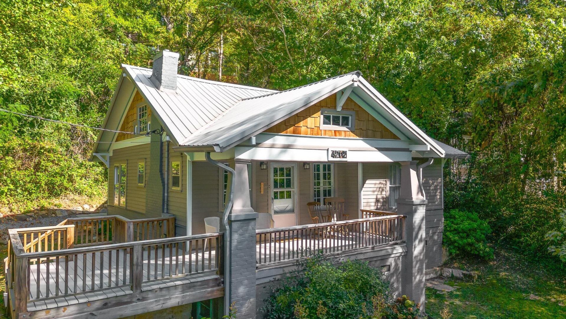 Truly charming 1929 bungalow nestled on Tennessee Avenue with timeless curb appeal and scenic mountain views. A classic stone staircase leads from the street to the home, enhancing its character and presence. The welcoming covered front porch with a ceiling fan sets the tone, offering the perfect spot to relax and enjoy the surroundings. Inside, original details shine throughout, including high baseboards, crown molding, hardwood flooring, and thoughtfully preserved architectural elements. The living room features a painted brick fireplace with built-in shelving on either side, while fully screened windows invite in fresh air and natural light. The separate formal dining room flows seamlessly into the kitchen through an elegant arched doorway. The kitchen is both stylish and functional, featuring stainless steel appliances, a brick backsplash, and display upper cabinets. A sliding barn door adds a modern touch, concealing a convenient half bath and laundry closet with a stackable washer and dryer. Step out back to a cozy patio, ideal for grilling and outdoor entertaining. Enjoy the best of Chattanooga living with walkability to St. Elmo and quick access to the vibrant Southside and downtown. This home perfectly blends historic charm with everyday convenience.