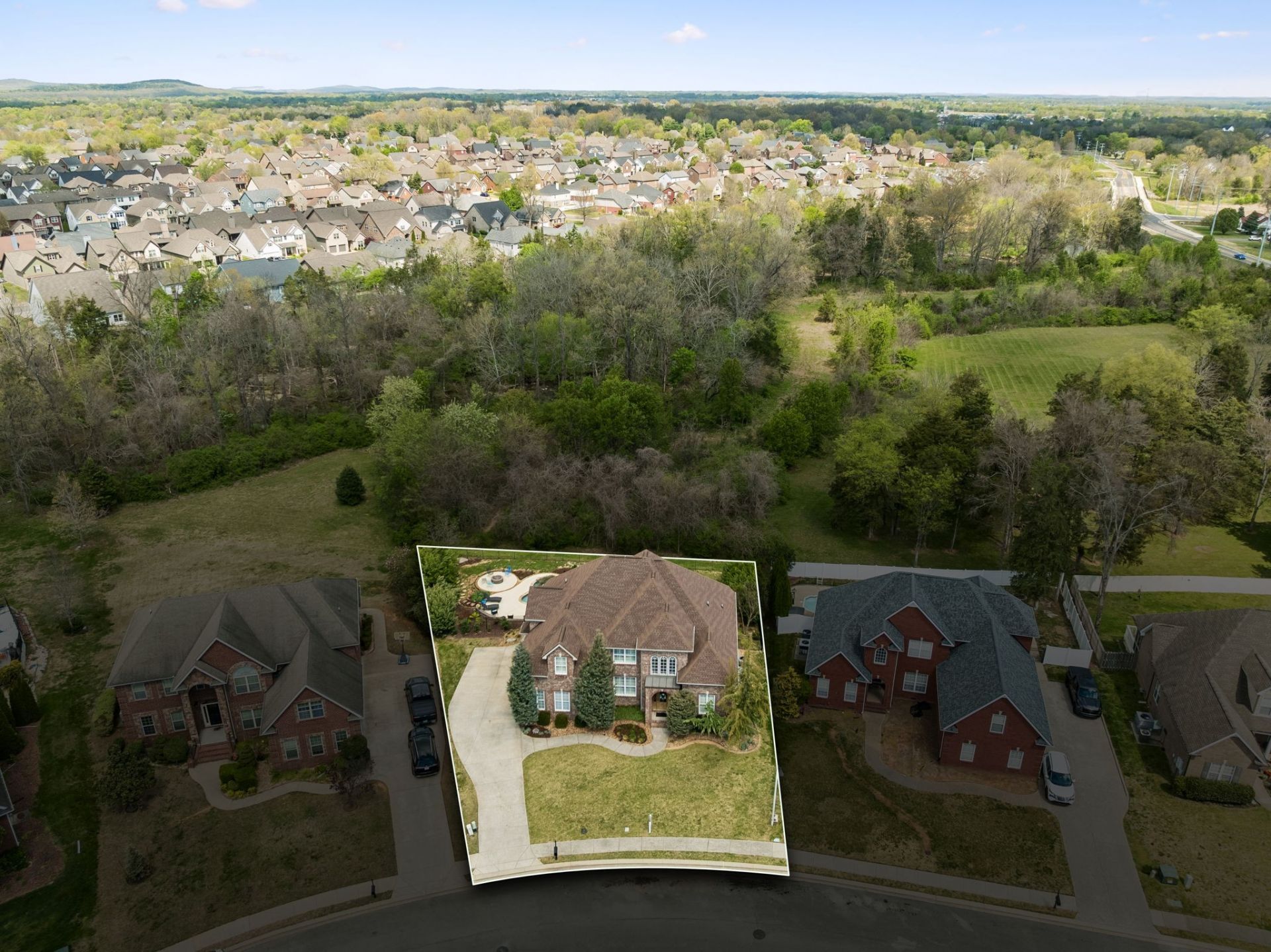 Exquisite home with so much to offer including your own personal retreat in the backyard with a gunite, self-cleaning pool. The home is located on a cul-de-sac lot with treed privacy behind & fenced backyard. The pool is surrounded by concrete with a fire-pit area, landscaping & area for chairs for relaxing. You'll feel welcome as soon as you walk up to the front door with glass panels & sidelights. Entering the home you'll love all the details of the trim, molding & the hardwood floors. The open floor plan includes the formal dining room with custom paint & wainscoting with beautiful chandelier with triple windows & plantation shutters. Entering the living room you'll see a wall of windows & sliding door that leads to the covered back porch, pool & backyard. The room has lots of trim, crown molding & a stone double-sided fireplace with so much attention to every detail. There are two arched doorways that lead to the kitchen & breakfast area or den. The chef's delight kitchen has custom white cabinets with glazing, granite tops with tile backsplashes & tile detail over the gas cooktop. There's a nice pantry, large island with eating overhang & stainless appliances including dishwasher, microwave, oven & refrigerator. The breakfast area or den includes the double-sided fireplace & a built-in bench area for seating. There are multiple windows & door to the pool & backyard. The main-level primary suite includes a sitting area (currently used as an office) with lots of trim, molding & windows with plantation shutters overlooking the back yard. There are two walk-in closets & primary bath including double vanity, large separate shower, tub, water closet & vanity sitting area. There are three additional bedrooms, two full baths, bonus room, laundry & attic storage upstairs. One bedroom is an ensuite with private bath. The bonus room has a wall of windows overlooking the pool, backyard & treed area behind the home. The bonus room has a custom wet bar & mini refrigerator.