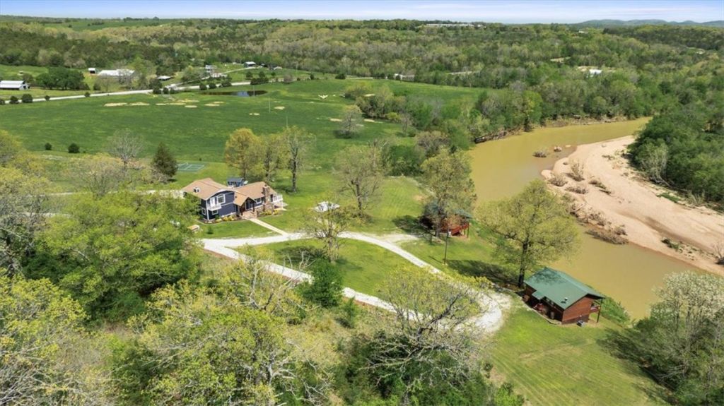 Stunning riverfront retreat on the Kings River with over 800 feet of private frontage. This rare 15.62-acre oasis offers endless possibilities, whether you're seeking a luxury getaway, income-producing property, or private family compound. The beautifully updated main home features 5 bedrooms, 3.5 baths, and 3,720 sq ft of inviting living space. In addition, two fully remodeled and furnished log cabins (each 620 sq ft) are currently successful short-term rentals. Designed for both comfort & self-sufficiency, the property includes clean well water, a whole-home generator, 15+ mature fruit trees, & abundant wildlife and fish. Enjoy a barn with stables, private shooting range, and even a pickleball court. Fish from your backyard on the pristine Kings River, known for its crystal-clear water and smallmouth bass. Located just 20 minutes to Eureka Springs, 12 to Eagle Rock Marina on Table Rock, and 20 minutes to Dogwood Canyon Nature Park. A once in a lifetime opportunity to own a true Ozark retreat.
