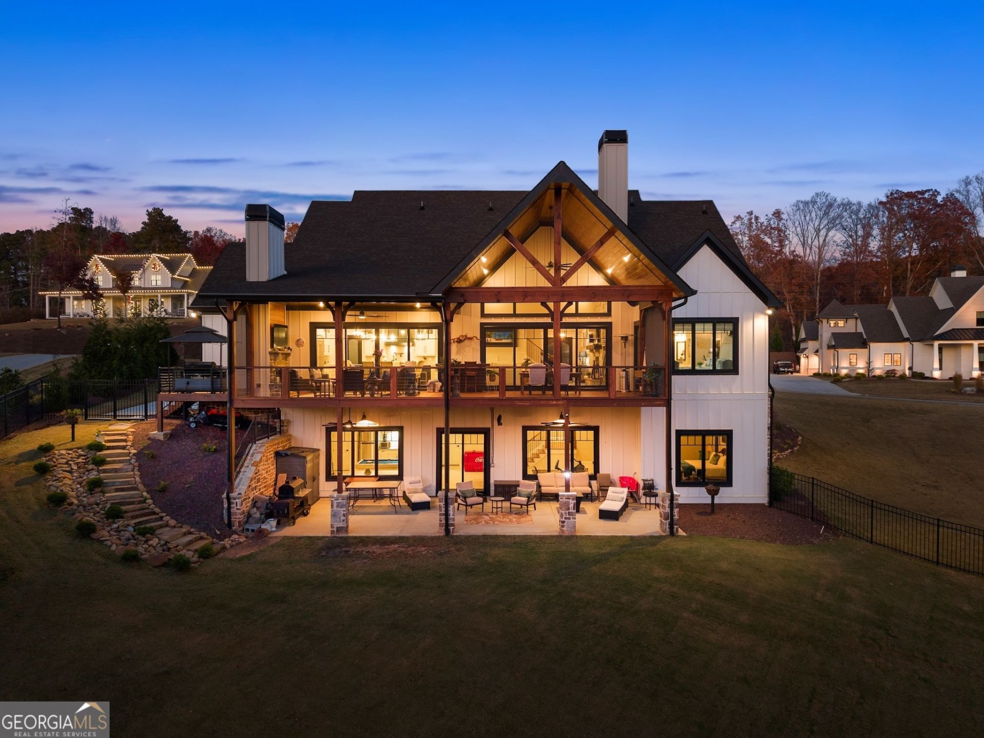 Experience Lake Lanier living at its best - luxury home at water's edge, sunset skies, effortless lake days, and the vibrant South Lake lifestyle right at your doorstep. With your private dedicated boat slip, you're moments from marinas, waterfront dining, and live music nights that make this side of the lake so loved. This home blends elevated design with relaxed lake-life living, creating a true waterfront retreat. Inside, the great room with lake views welcomes you with soaring wood-beam ceiling, floor-to-ceiling stone fireplace, and warm, inviting atmosphere that flows naturally into the chef's kitchen featuring a waterfall quartz island, premium appliances, and a walk-in pantry. Two sets of sliding glass doors open the main level to a full-length screened-in porch and expansive back deck, giving you true four-season living - morning coffee as the lake wakes up, afternoons of grilling and laughter, and evenings spent unwinding under the glowing golden hour sunset skies. This outdoor living space becomes the heart of the home, where gatherings of all sizes feel effortless and unforgettable. The main level primary suite offers a peaceful retreat with a vaulted wood ceiling, calming Lake views, and a spa - inspired bath, with heated floors, soaking tub, oversized frameless shower, and dual closets. A powder room and spacious laundry room complete the main level. Upstairs, and en-suite bathroom/bedroom, two additional spacious bedrooms with shared bath, and a large bonus room provide comfort and flexibility for guests of all ages. The bonus room is ideal for a movie lounge, playroom, or home office - whatever fits your lifestyle. The terrace level is designed for fun and relaxation, featuring tall ceilings, a full wet bar, game area, generous living space, and an oversized flex room with its own bath perfect for additional bedroom, gym or hobby space. It's the ideal backdrop for movie nights, game days, and weekend hangouts. Outside the large level fenced in backyard becomes your lakeside playground - room for fun and games, space to entertain, and easy gate access to the water's edge shoreline for kayaking, fishing, paddle boarding, or simply enjoying quiet moments by the water. With a new price, this home delivers incredible value for a true South Lake waterfront retreat - elevated, inviting, and designed for the way people love to live on Lake Lanier!