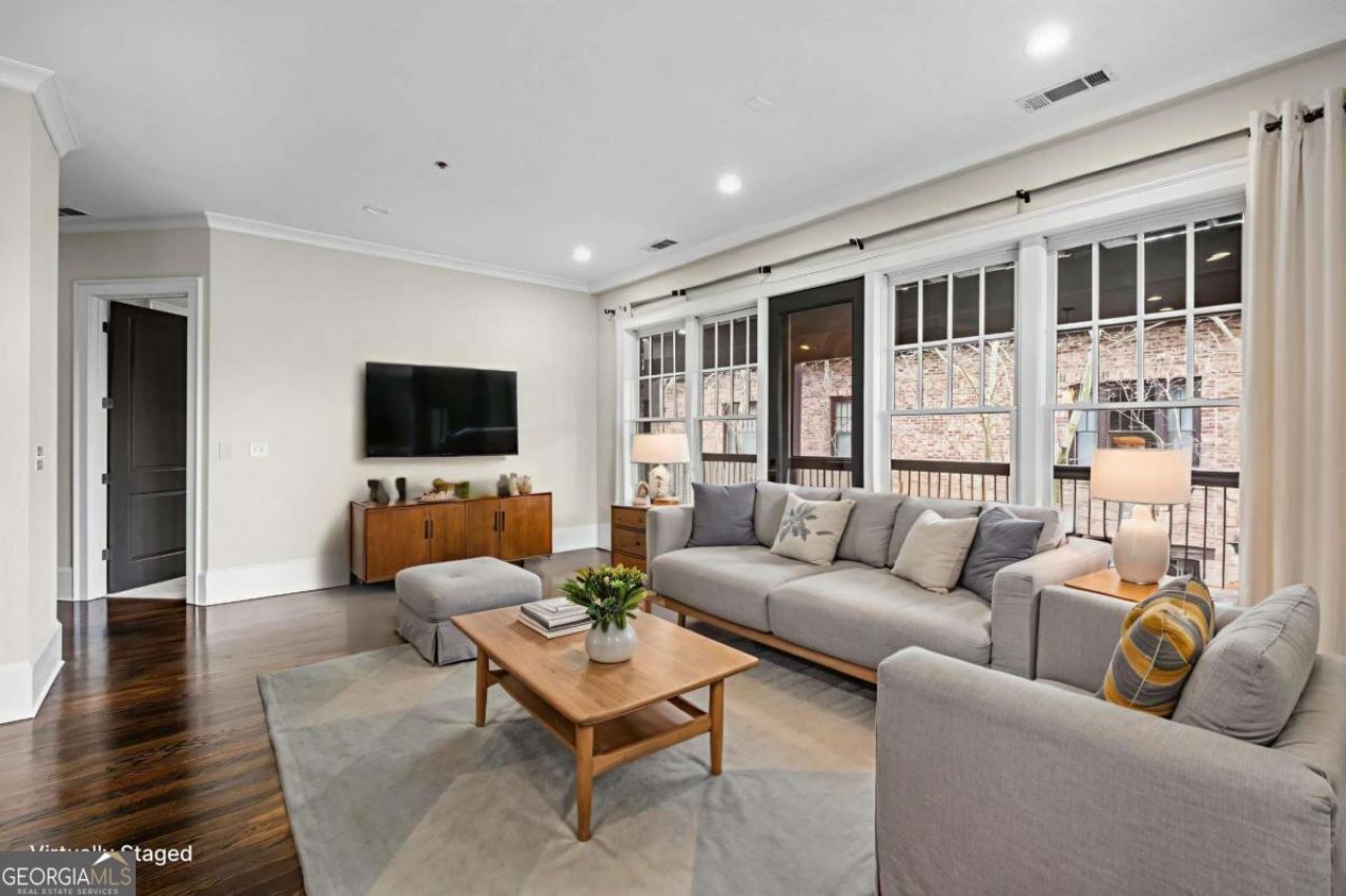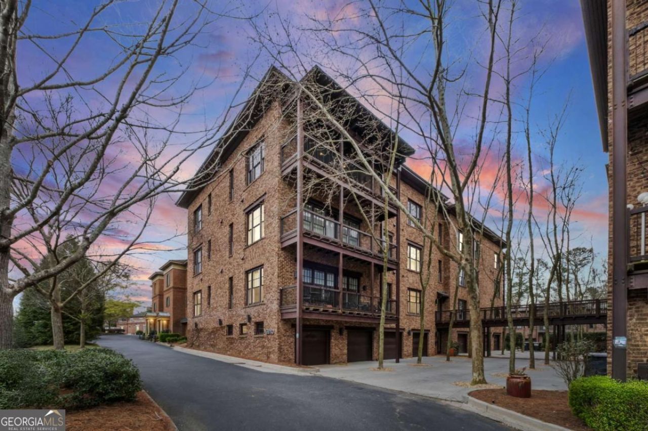 Stunning 4th-floor residence (Unit 403) in the heart of Vickery Village, one of Forsyth County's most sought-after live-work-play communities. This beautifully maintained 2-bedroom, 2.5-bath condo offers elevated views, abundant natural light, and beautiful sunset vistas from the private balcony, creating the perfect setting to unwind at the end of the day. The open-concept floor plan features high ceilings, gleaming hardwood floors throughout the main living areas, spacious living and dining spaces, and a seamless flow ideal for both everyday living and entertaining. The well-appointed kitchen includes custom cabinetry, a large center island, and high-end appliances, making it the true heart of the home. Both bedrooms are generously sized with private en-suite baths, including a primary suite featuring dual vanities with granite countertops. New carpet adds a fresh, move-in ready feel, while the building's new roof provides added peace of mind. An oversized tandem garage offers space for two vehicles plus a golf cart or additional storage, an exceptional feature in this community. Residents enjoy secure building access, elevator service, and true lock-and-leave convenience. Just steps from your door, Vickery offers an unmatched lifestyle with boutique shopping, restaurants, brewery, YMCA, parks, two stocked lakes, miles of walking trails connecting to the Big Creek Greenway, a resort-style pool, tennis and pickleball courts, and year-round community events. Exceptional opportunity to enjoy low-maintenance living in one of Forsyth County's most desirable communities.