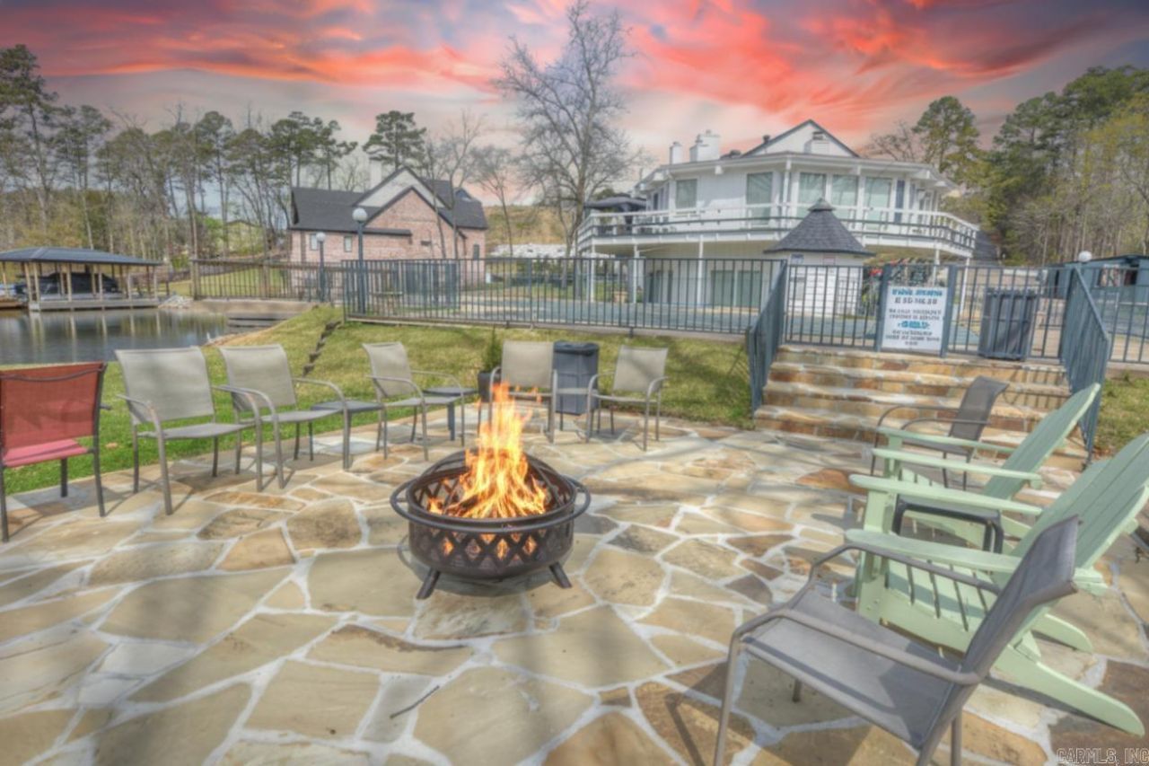 Nestled at the end of Grand Point Drive, the Treehouse Condo community offers a rare, island-like setting surrounded by the serene waters of southeast Lake Hamilton. Developed in 1980, this gated complex provides the expansive green space and quiet privacy that newer developments often lack. With a 30-day minimum rental policy and a reputation for "awesome neighbors," it is the ultimate retreat for vacation owners seeking tranquility. This two-story, second-floor unit is offered fully furnished and move-in ready. The main level features a primary suite with a walk-out balcony and a cozy living area with a wood-pellet fireplace. The kitchen is fully equipped for entertaining with a standard refrigerator, a counter-height drink fridge, and a dedicated ice maker. Two additional bedrooms and a full bath are located on the second level, providing plenty of space for guests. The property has undergone extensive recent updates, including a new roof (2025), fresh exterior paint (2024), a rebuilt pool deck (2025), and a resurfaced parking lot (2026). Boaters will love the covered slip with a 10,000 lb. hydraulic lift and recently replaced docks (2024).