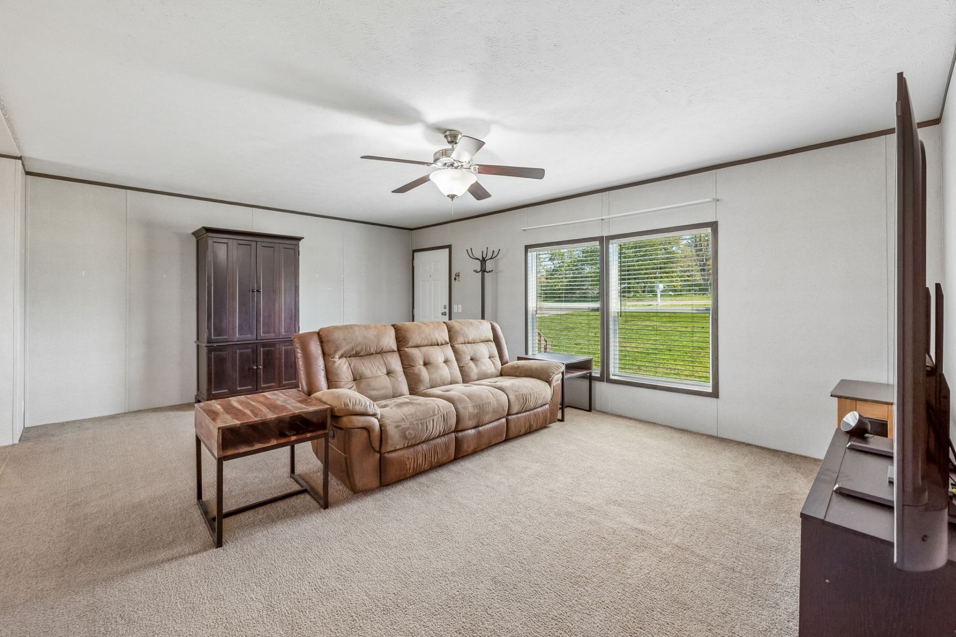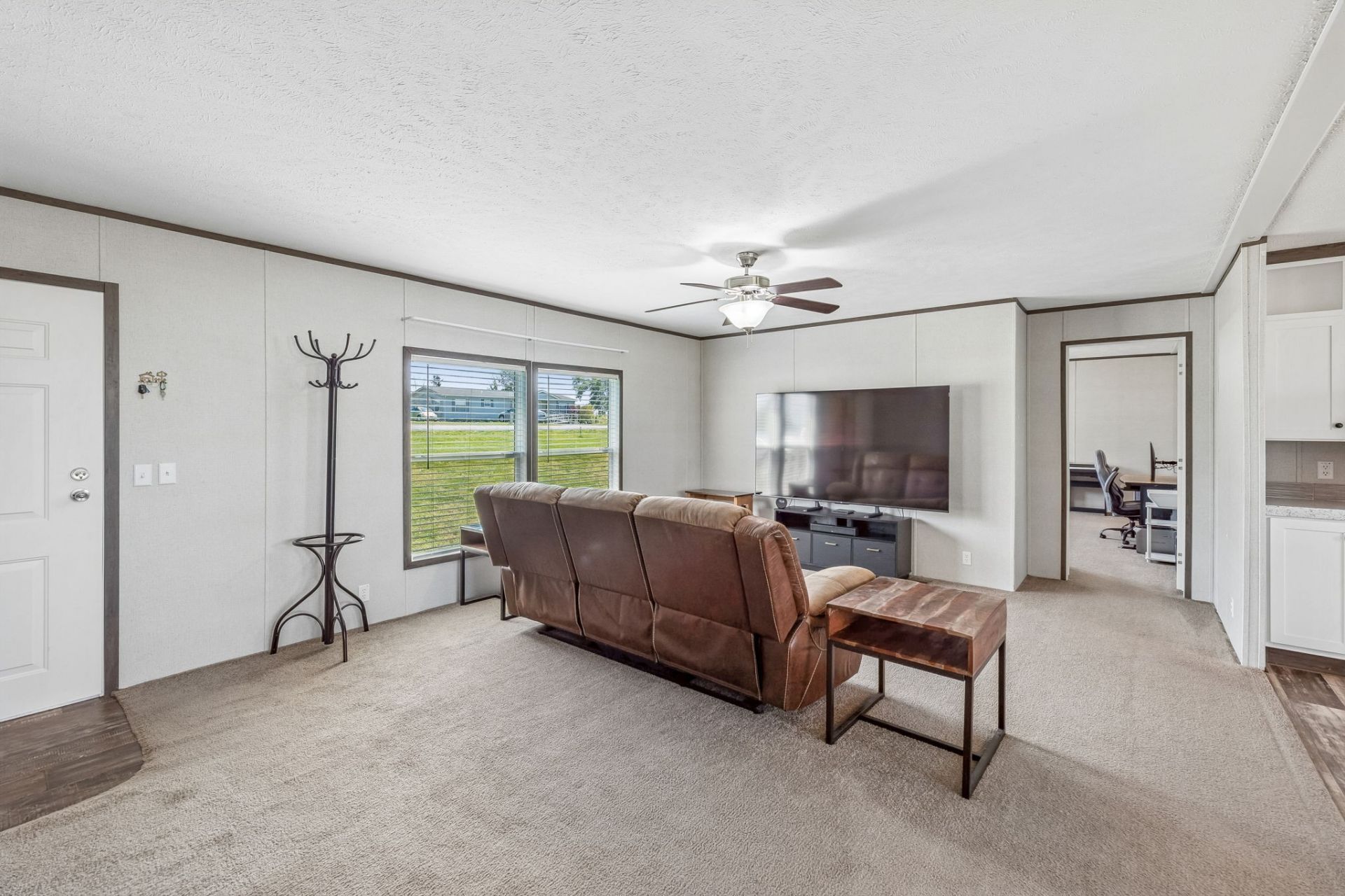 Enjoy country living in this 2023 manufactured home on a permanent foundation, situated on over an acre. This 3-bedroom, 2-bath home features an open floor plan ideal for everyday living. The kitchen offers a large island and abundant cabinetry. The spacious primary suite includes a tiled walk-in shower. A huge laundry room provides additional storage and functionality. Property also includes a 12x16 storage building and plenty of outdoor space.